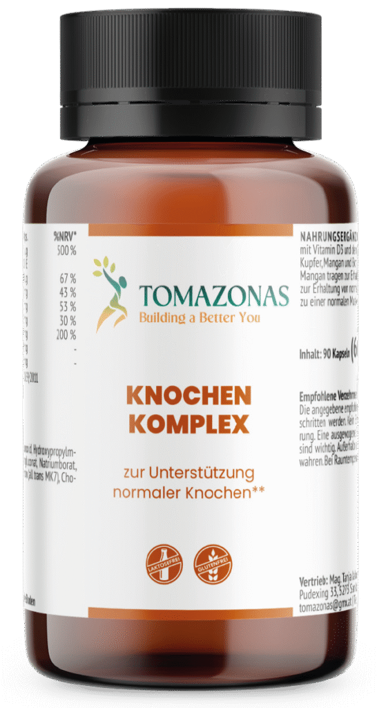 KNOCHEN KOMPLEX ist eine sorgfältig abgestimmte Kombination essentieller Vitamine und Mineralstoffe wie Vitamin D und K, Kupfer, Mangan und Bor. Vitamin D sowie Calcium, Magnesium und Mangan sind wichtige Vitalstoffe zur Unterstützung des Er-halts normaler Knochen. Hochwertiges Vitamin K2 (Menachinon) vervollständigt die Rezeptur, indem es maßgeblich am Knochen-stoffwechsel beteiligt ist und zum Aufbau sowie zum Erhalt einer normalen Knochendichte beiträgt.