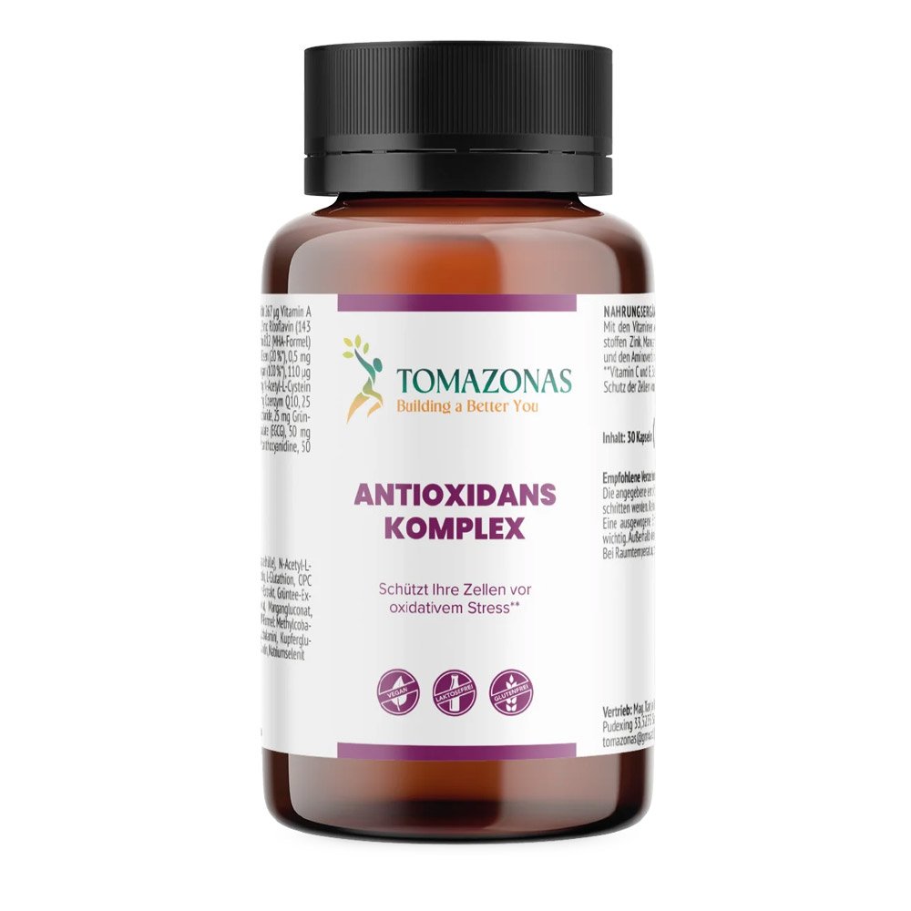 Freie Radikale entstehen durch oxidative Prozesse und belasten unseren Körper mit oxidativem Stress. In unserem ANTIOXIDANS KOMPLEX kombinieren wir wertvolle Vitamine, Mineralstoffe und Pflanzenstoffe. Vitamin C und E, Selen, Mangan und Zink tragen allesamt zum Schutz der Zellen vor oxidativem Stress bei.